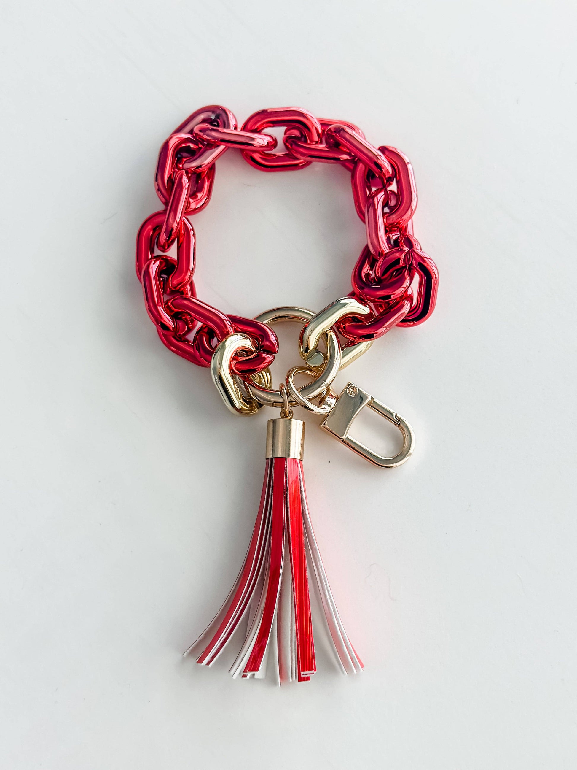 This lightweight keychain is made of acrylic chain links and includes a tassel. It's perfect for attaching to your wrist or clipping to your purse or bag. And it comes in a variety of colors to match your style.