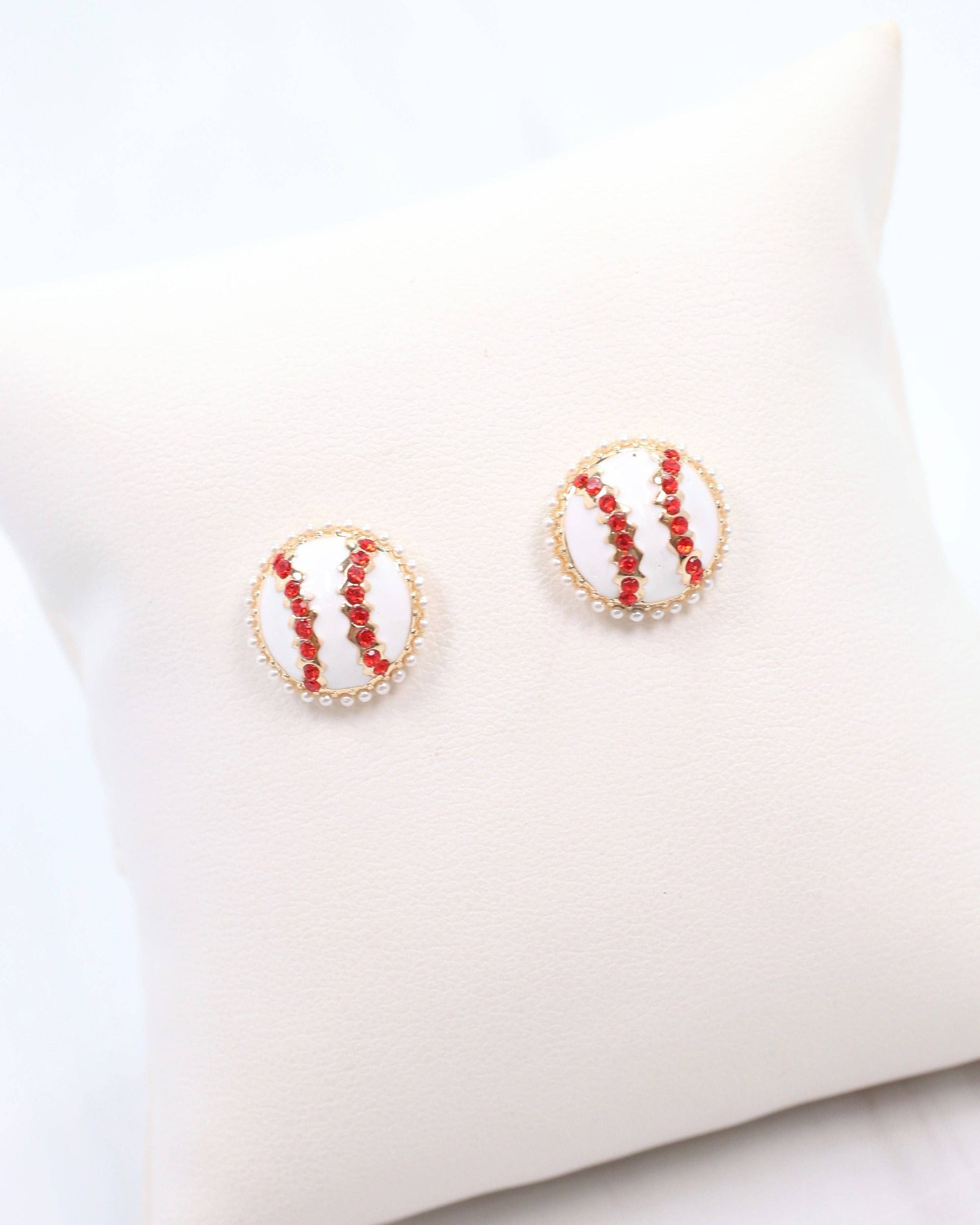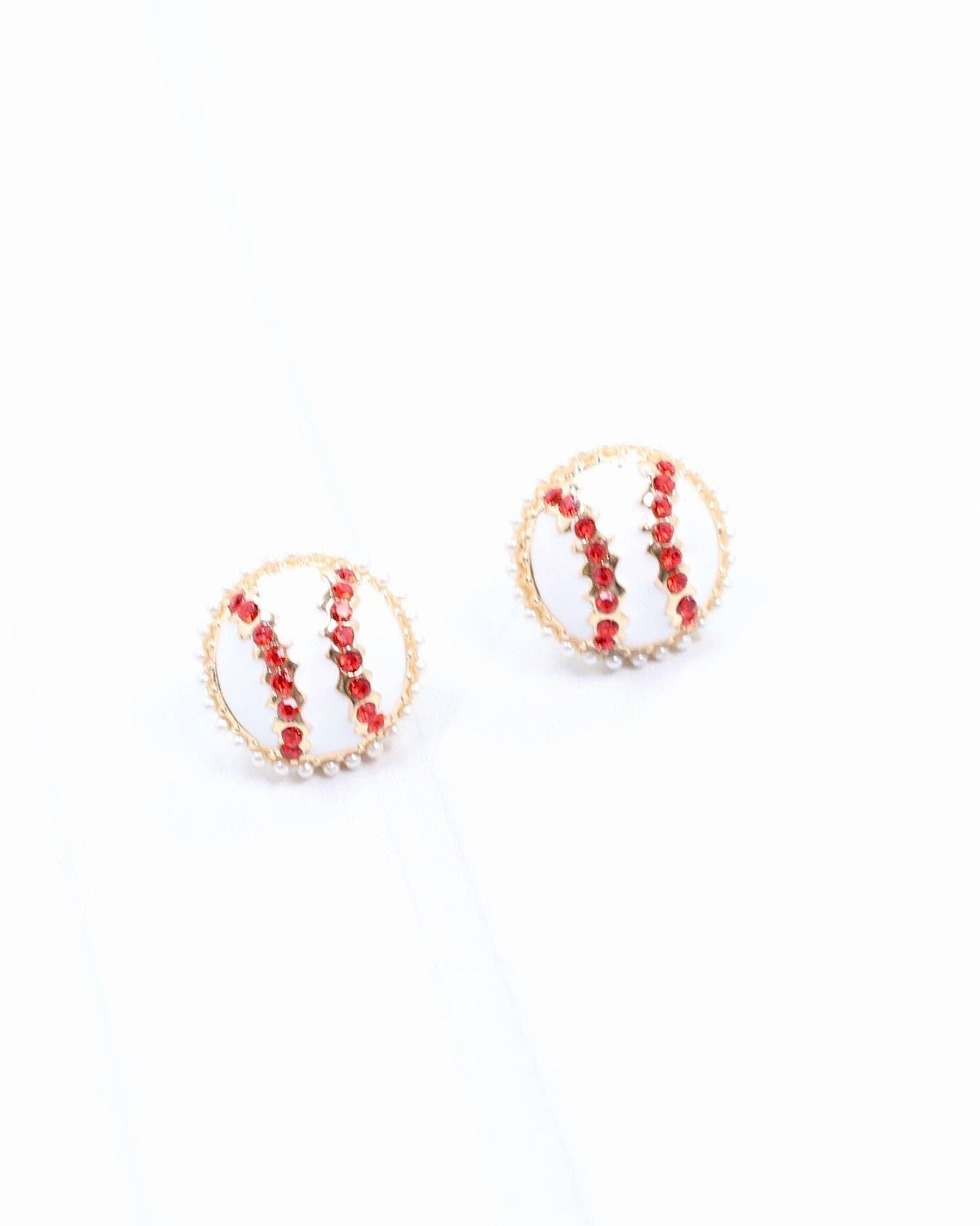 Show your team spirit with Billy Jo Baseball Stud White earrings! These enamel baseball studs feature a red crystal center and petite pearls for a touch of glam. The perfect accessory for any game day outfit.