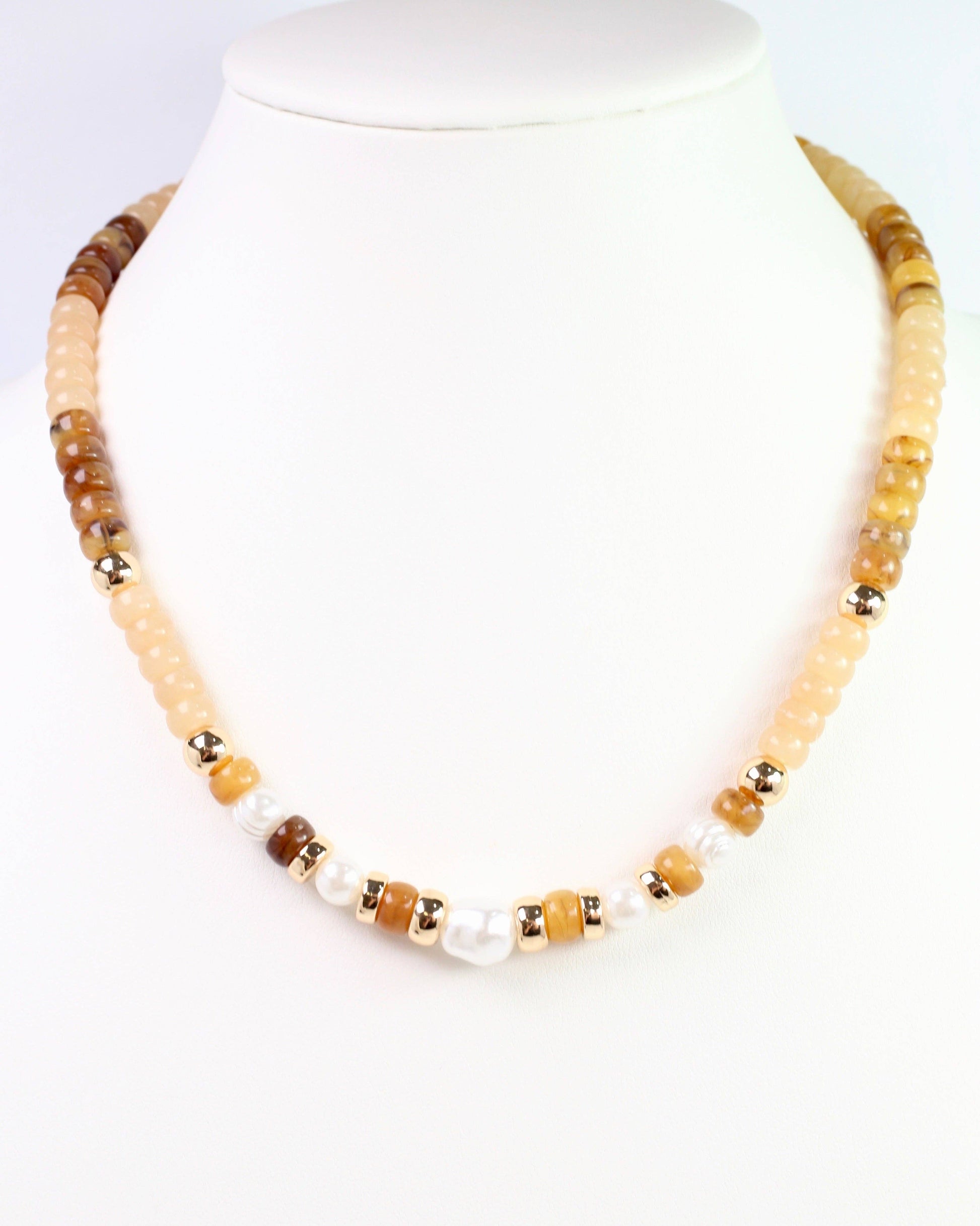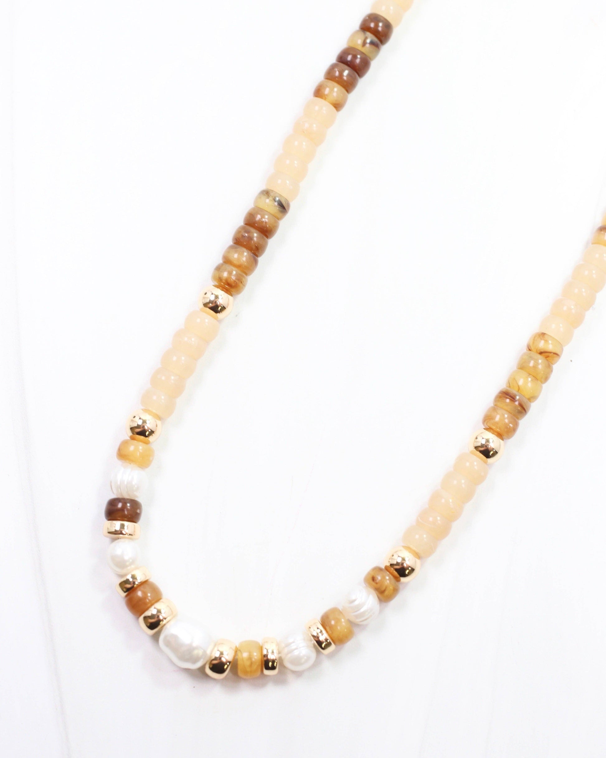 Add a pop of playful charm with the Bowie Bead and Pearl Necklace in Brown. This vibrant mix of multi-tone beads paired with delicate pearl accents creates a fun, eye-catching accessory perfect for brightening any outfit. Whether dressing up or down, this necklace brings a lively twist to your look.