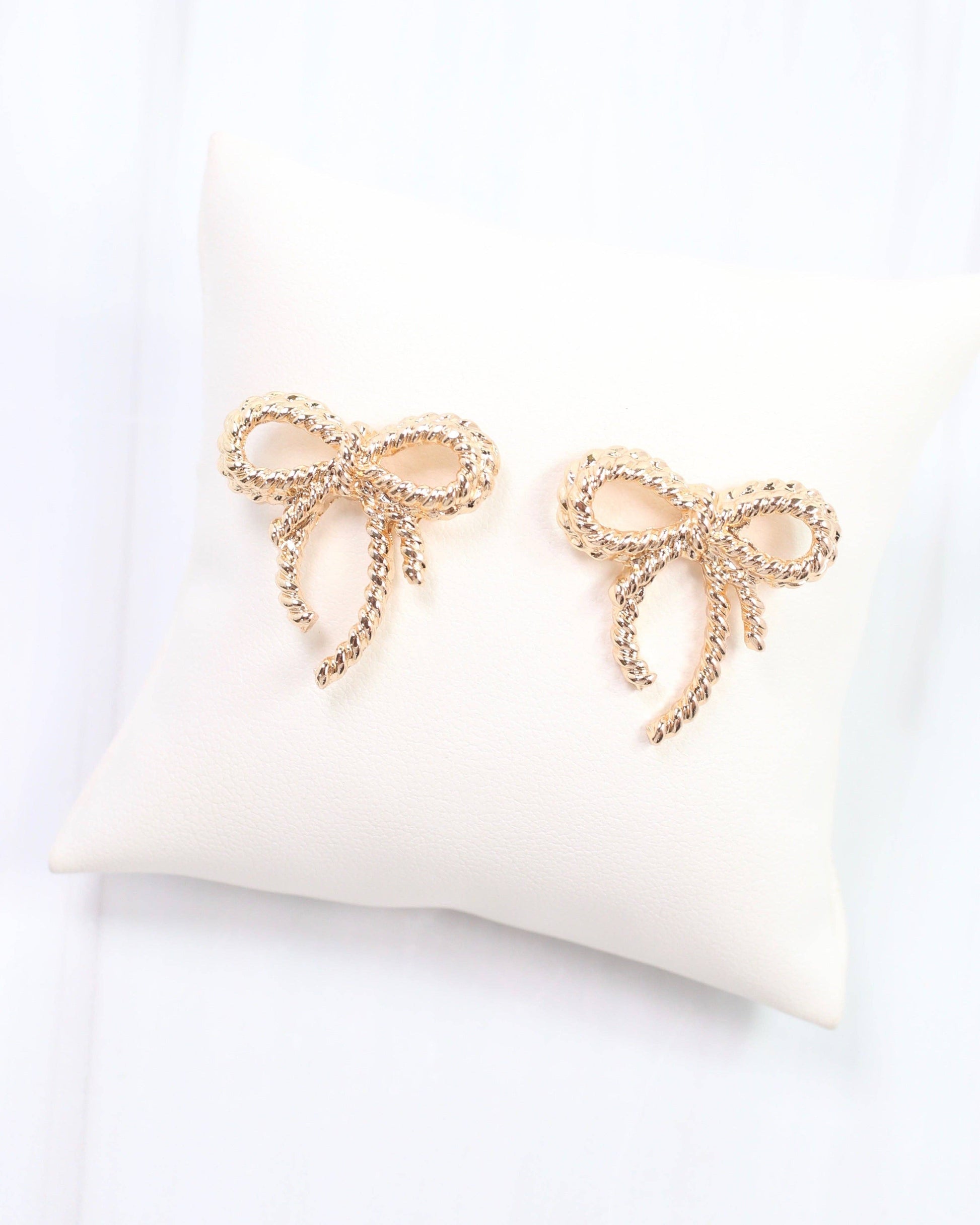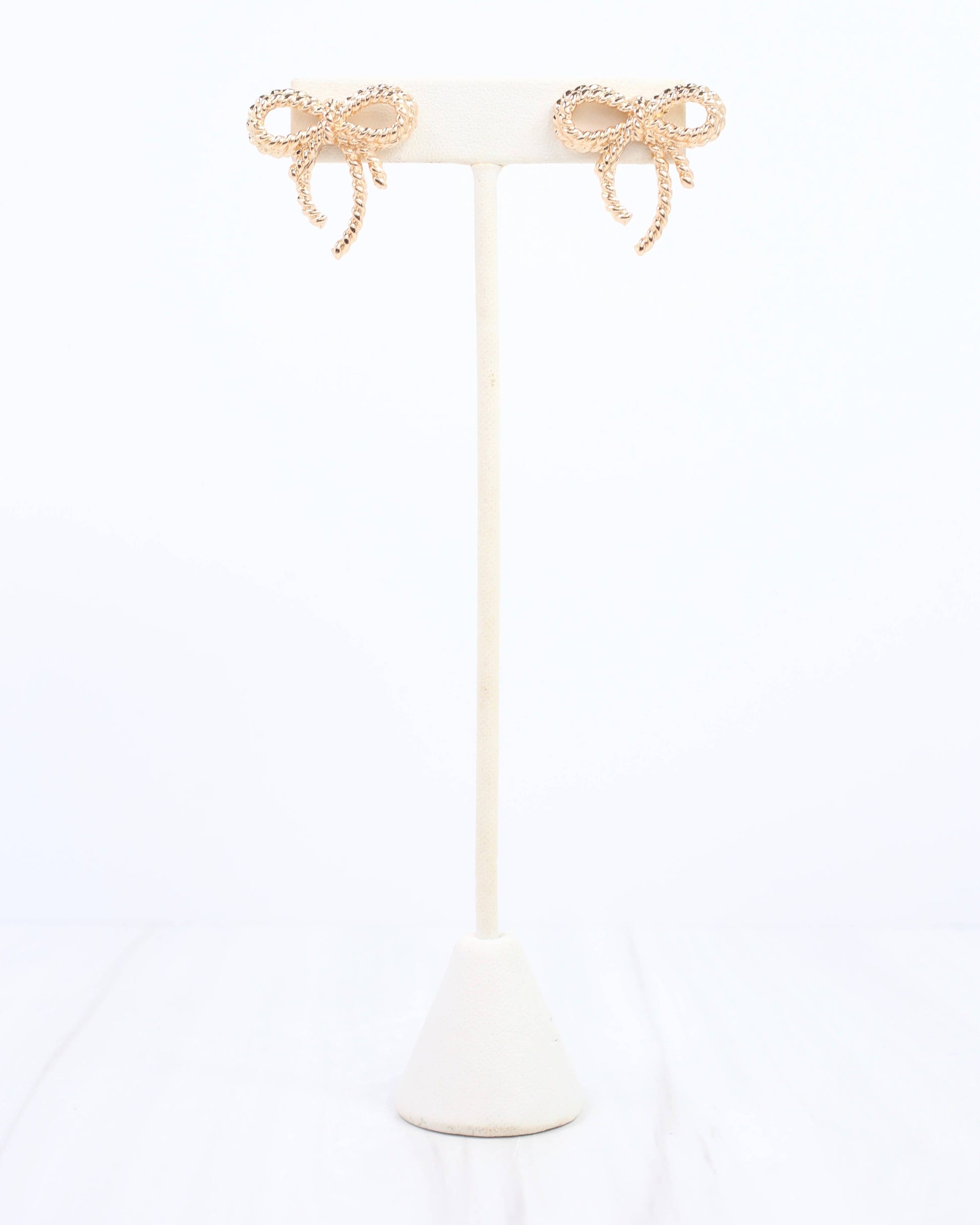 Add a touch of whimsy to your look with the Branson Textured Bow Stud Earring in Gold. These shiny, rope-textured bows create a playful twist on a classic stud, perfect for everyday charm or brightening up your party outfit.