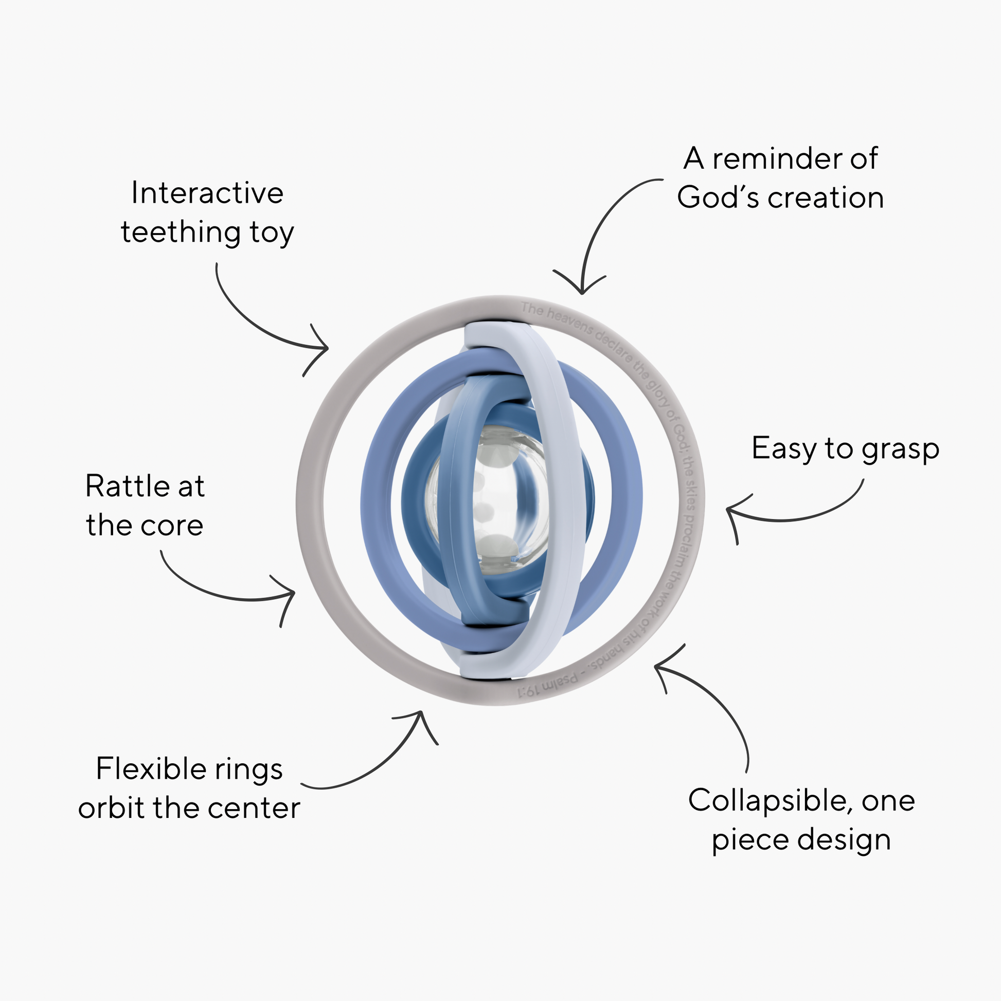 Where playtime meets the stars! Embark on a cosmic adventure with the Creation Rattle, an interactive teething toy featuring five colorful silicone rings, a rattle at its core, and a reminder of God’s creation with Psalm 19:1.