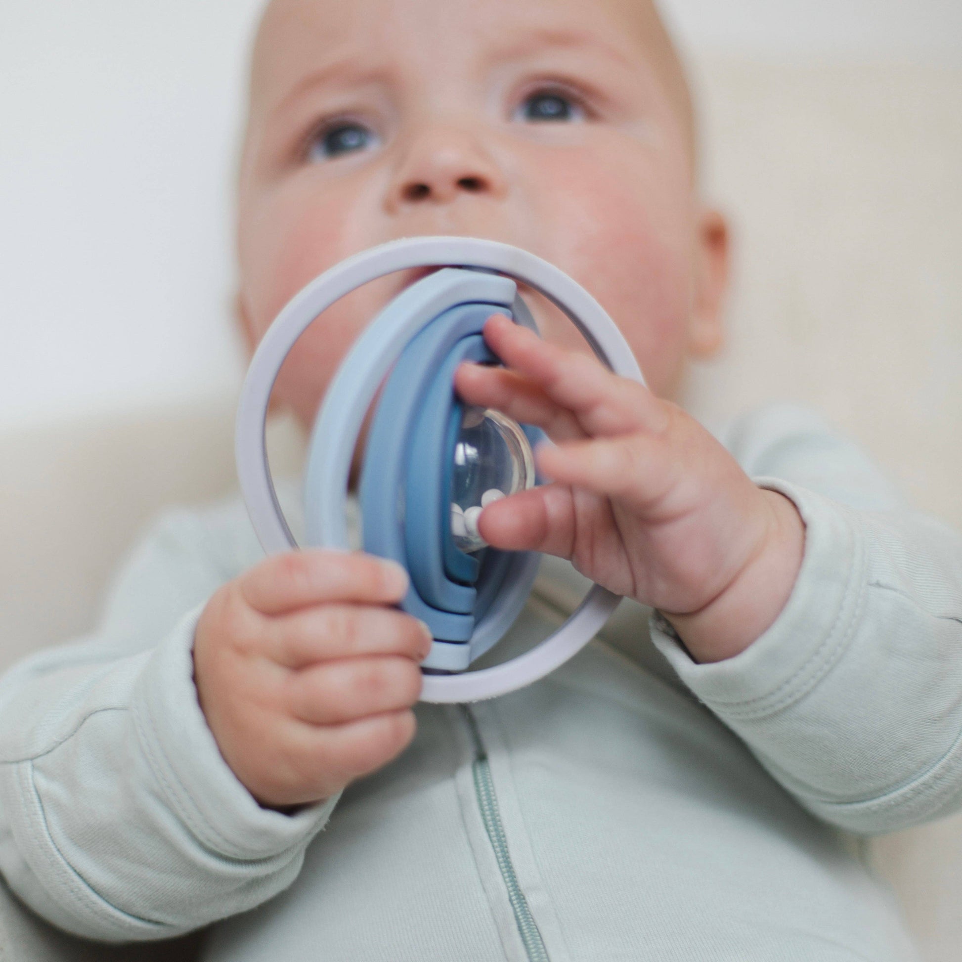 With its flexible rings orbiting the center, this innovative design makes it easy for little hands to grasp, aiding in the development of fine motor skills, while the rattle nurtures valuable auditory stimulation. Made from 100% safe materials, the soft silicone is gentle on baby’s skin yet durable enough to soothe sore gums.