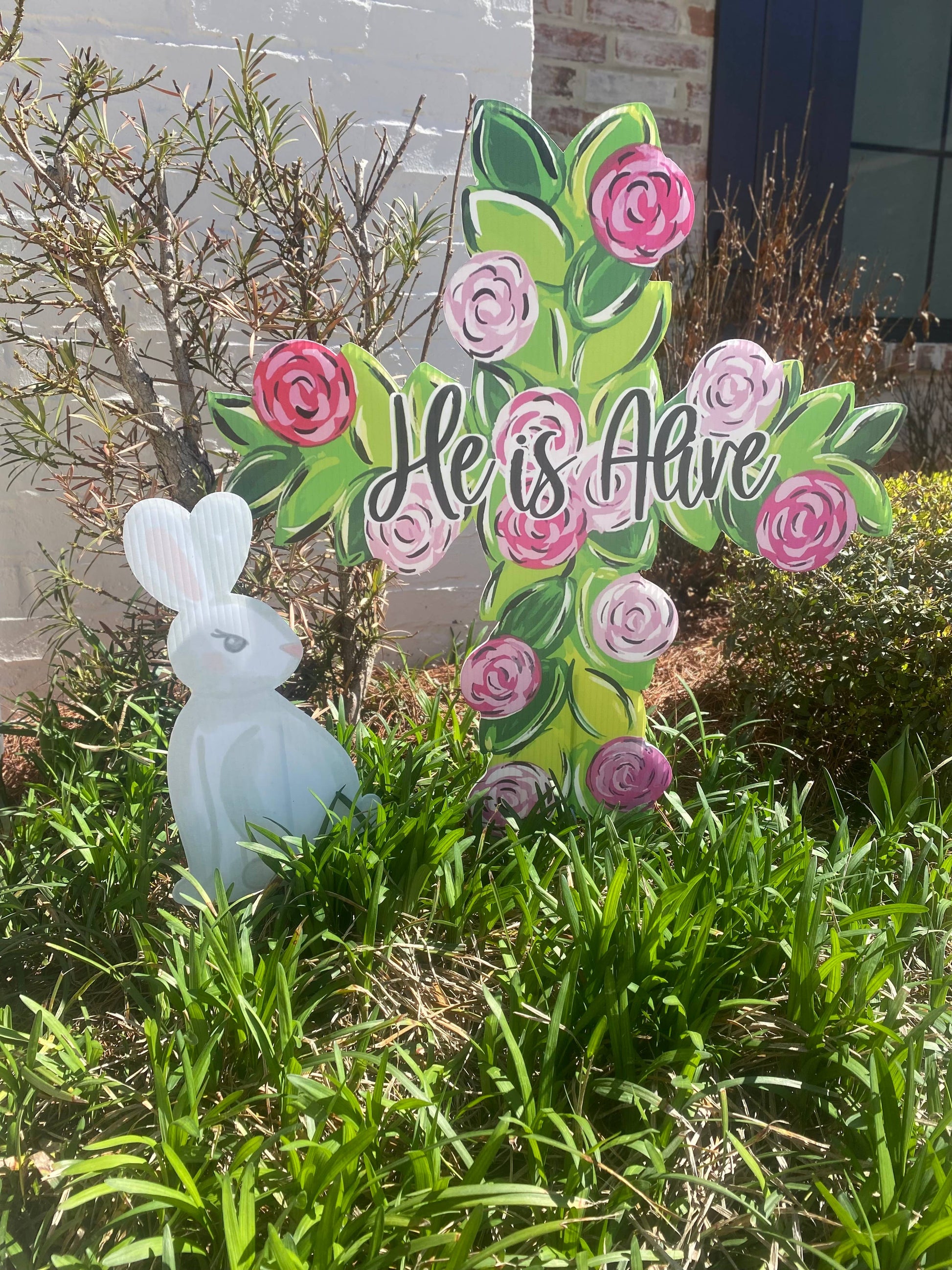 Spread some joy with our Flower Cross yard sign! This weather resistant sign brings beauty to your lawn and includes a stake for easy display.