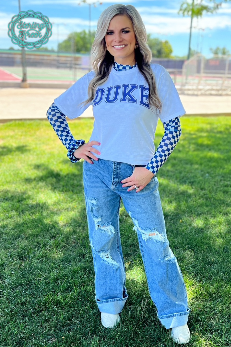 Get ready to cheer in style with our Pep Rally Mesh Top! This uniquely designed top features a fun blue and white checked mesh that will keep you cool and comfortable during your next rally. Stand out in the crowd and show off your team spirit with this playful and flirty top.