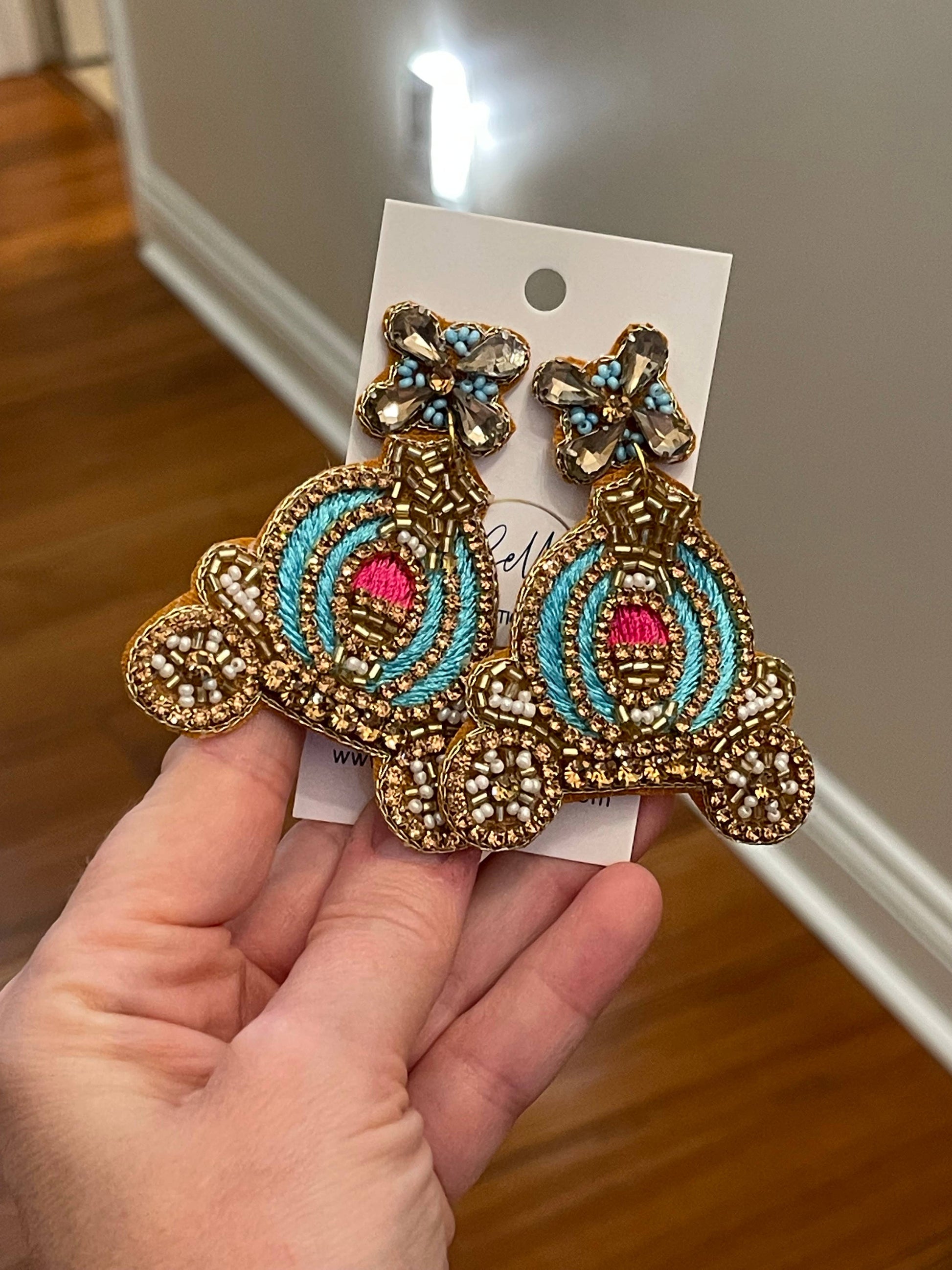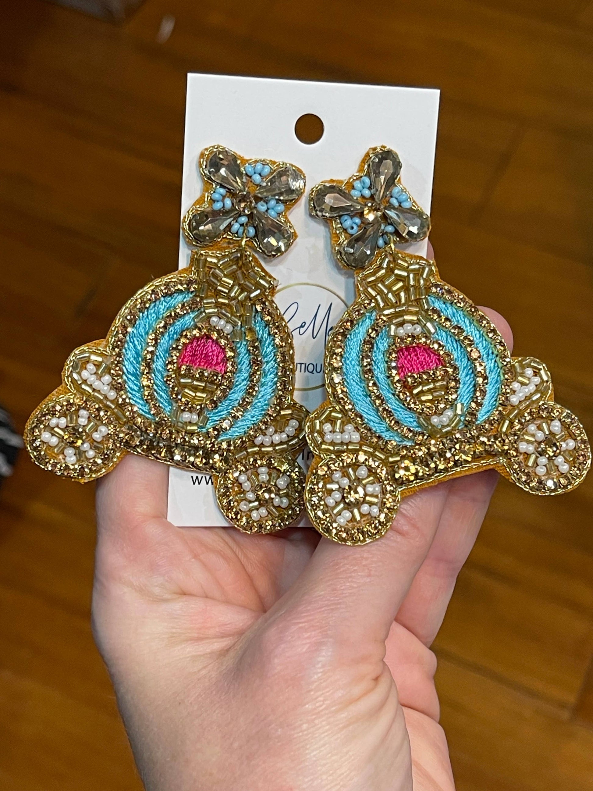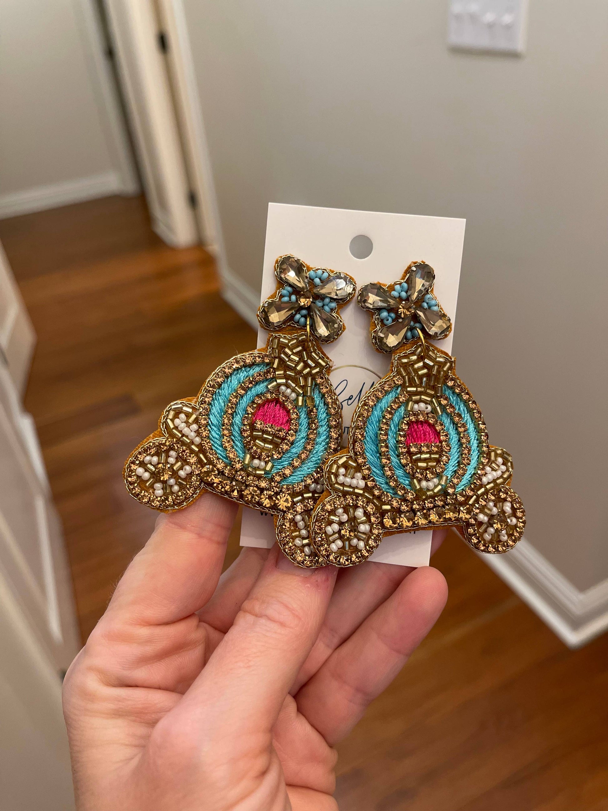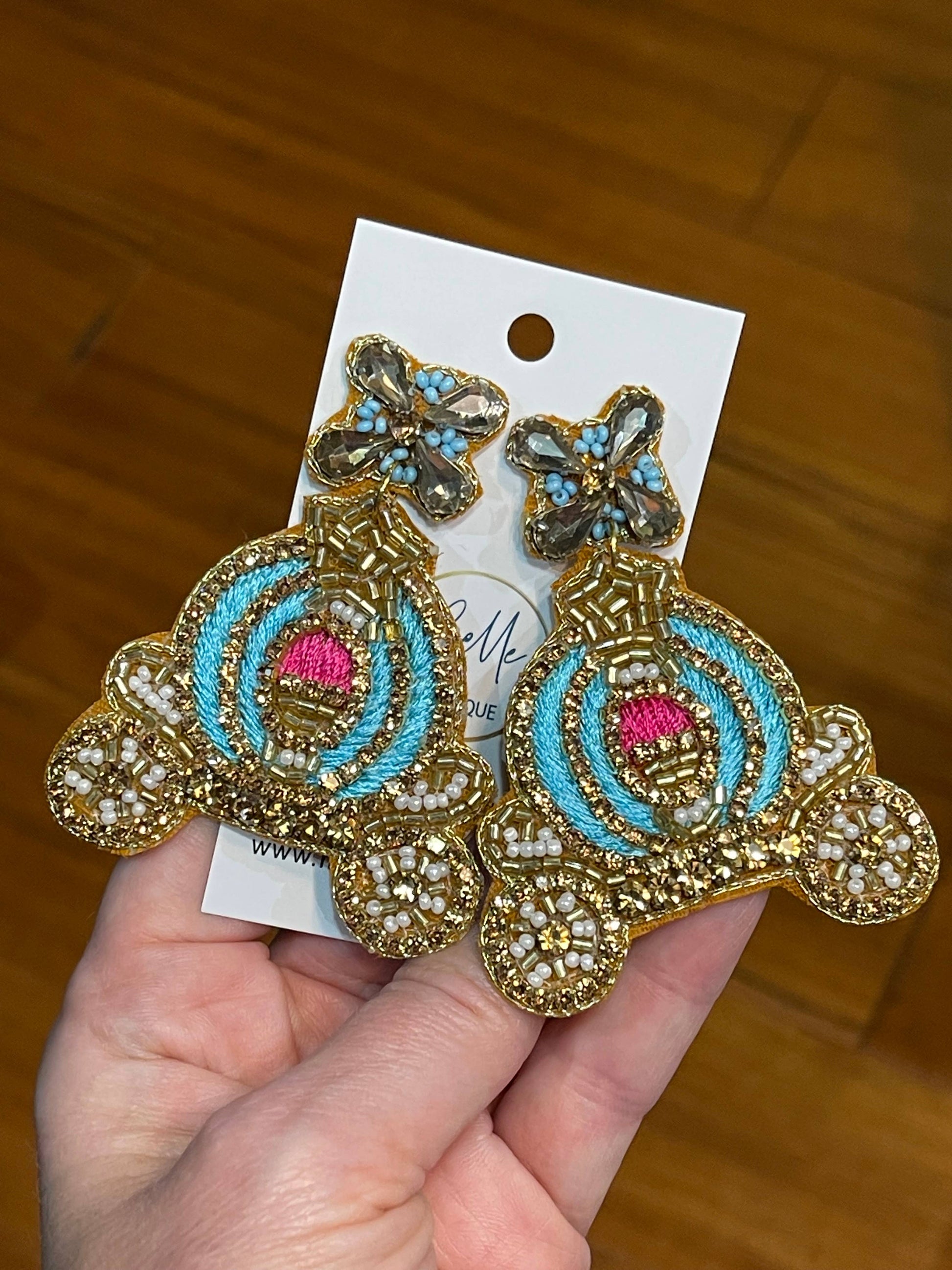 Custom made Mon Belle Amie earrings - stitched and beaded. These Princess Carriage Earrings are perfect for those who love Magic Kingdom any time of the year!