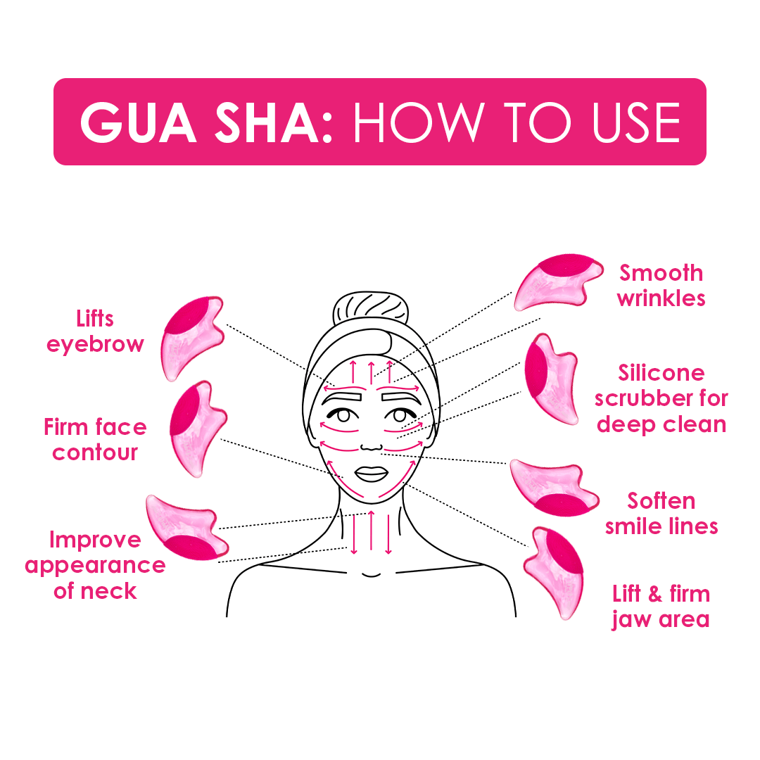 Apply a serum or oil to the skin to begin sculpting. Start in the center of face & scrape outwards. Use the divot on the nose, in between brows & along the jawline. Use the longer edges on cheeks & forehead.