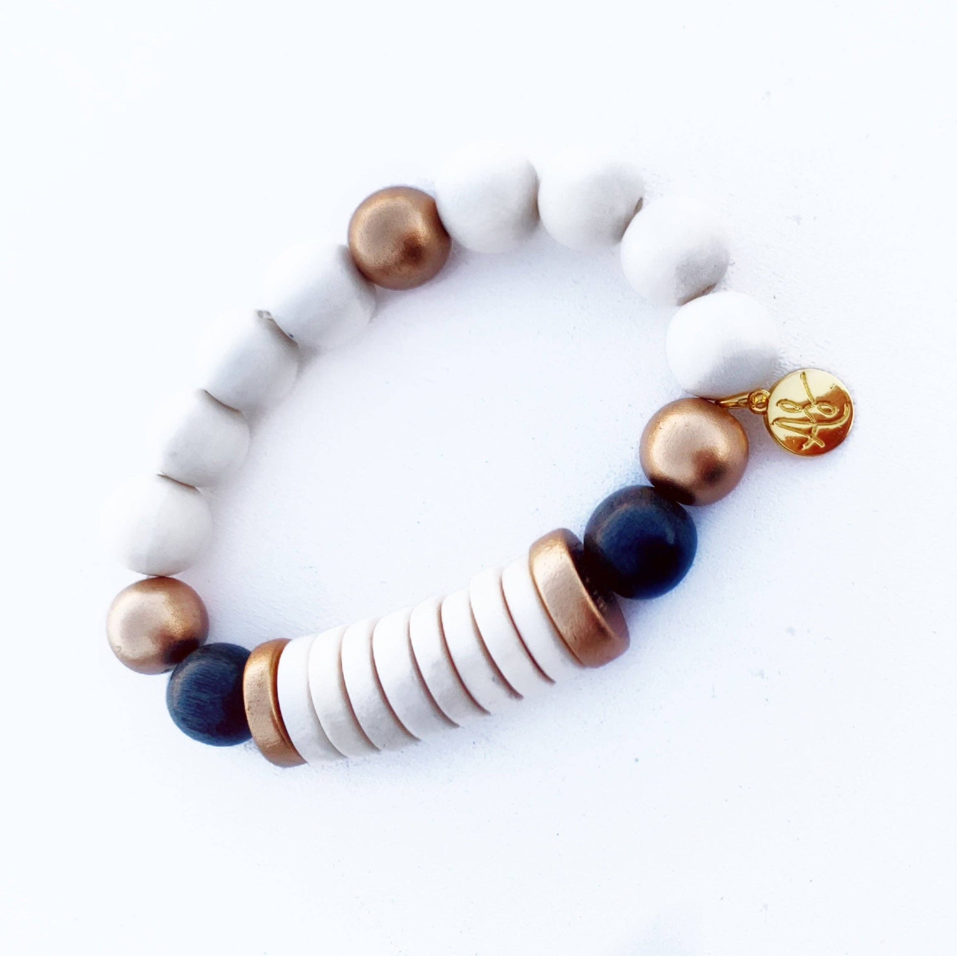 Features wood beads with our signature gold brand charm, Audra Style WHite and Gold disk beads with Black White and matte gold beads..